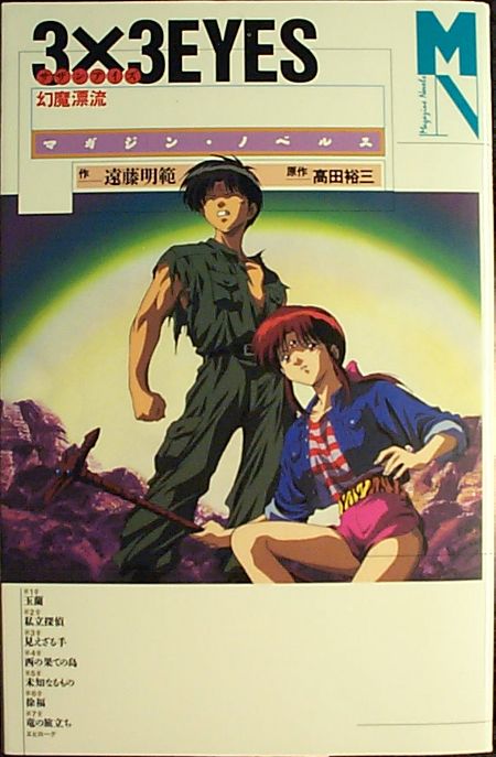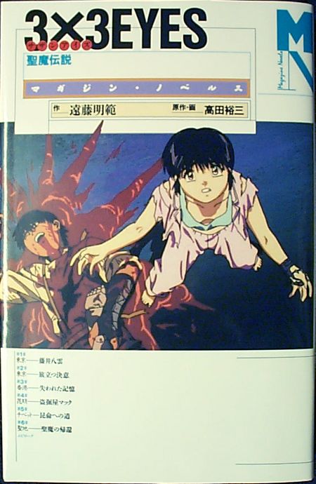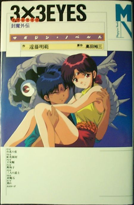 The 3x3 Eyes novels are written by Akinori Endo, the scriptwriter for the original 3x3 Eyes anime. Each novel comes with a mini-poster and bookmark. There are scenes from the new anime series printed in the corner of each page, and the scenes "move" if you look at them while quickly flipping the pages. If you can't read Japanese, that's about all you'll get out of these books. (I hear that at least some of the books have been translated into Chinese.)